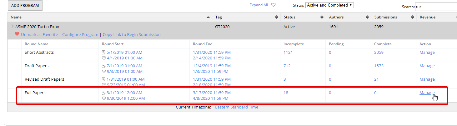 That is quite a bit. But now full papers can start to roll in and you can manage them in the same way you managed the other rounds, by clicking Manage. You can run reports, view the submissions, etc.